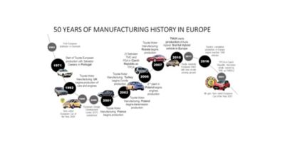 Marvin Cooke, executive vice president van Toyota Motor Europe, vertelt: “We zijn er trots op dat we de mijlpaal van vijftig jaar productie in Europa zijn gepasseerd. Het feit dat we meer dan twee derde van de auto’s die we in Europa verkopen, ook in Europa geproduceerd hebben, betekent dat we een belangrijke bijdrage leveren aan de werkgelegenheid in Europa. Daarbij beperken we onze impact op het milieu doordat we relatief veel geëlektrificeerde modellen produceren waar we die ook verkopen. Daardoor realiseren we steeds de doelstellingen op het gebied van CO2-emissies van onze auto’s.”
